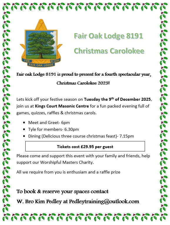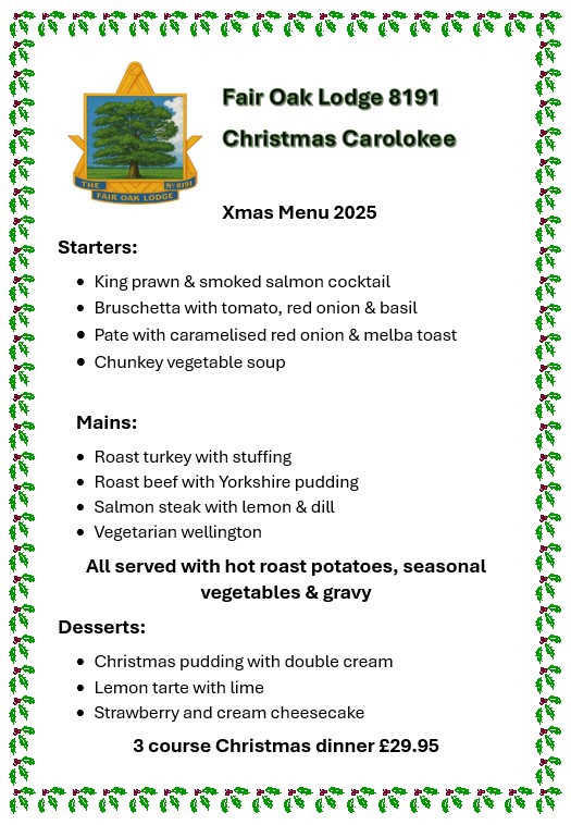 Fair Oak Lodge 8191- Christmas Carolokee on Tuesday 9th December 2025